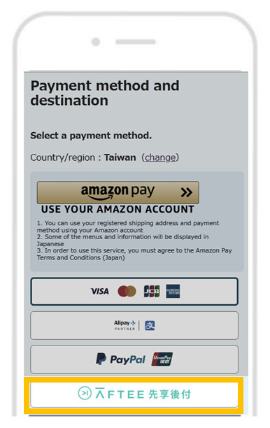 除了VISA、MasterCard、AMEX和JCB之外,您還可以通過PayPal、Amazon Pay、AliPay或中國銀聯支付來進行支付。